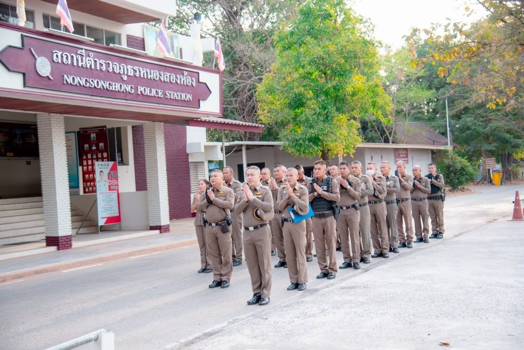 พร้อมด้วยข้าราชการตำรวจ สภ.หนองสองห้อง ร่วมเคารพธงชาติ สวดมนต์ไหว้พระ กล่าวบทปลงใจ ท่องอุดมคติตำรวจ ปฏิญาณตน ประชุมชี้แจงข้อราชการ ข้อสั่งการ และนโยบายผู้บังคับบัญชาให้ได้รับทราบและถือปฏิบัติ ดังนี้.-