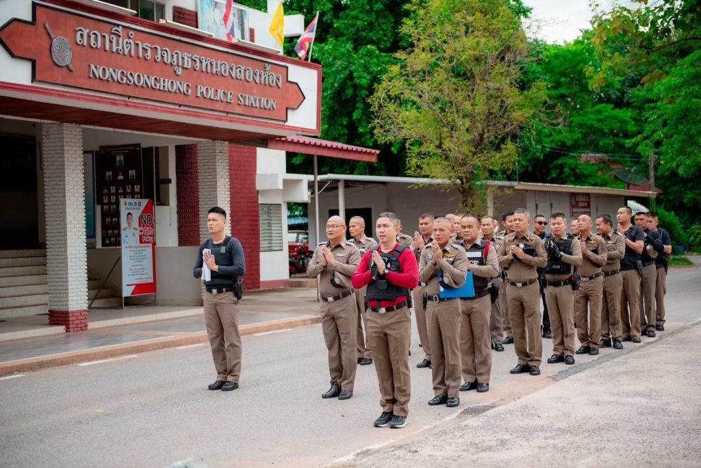 พร้อมด้วยข้าราชการตำรวจ สภ.หนองสองห้อง ร่วมเคารพธงชาติ สวดมนต์ไหว้พระ กล่าวบทปลงใจ ท่องอุดมคติตำรวจ ปฏิญาณตน ประชุมชี้แจงข้อราชการ ข้อสั่งการ และนโยบายผู้บังคับบัญชาให้ได้รับทราบและถือปฏิบัติ ดังนี้.-