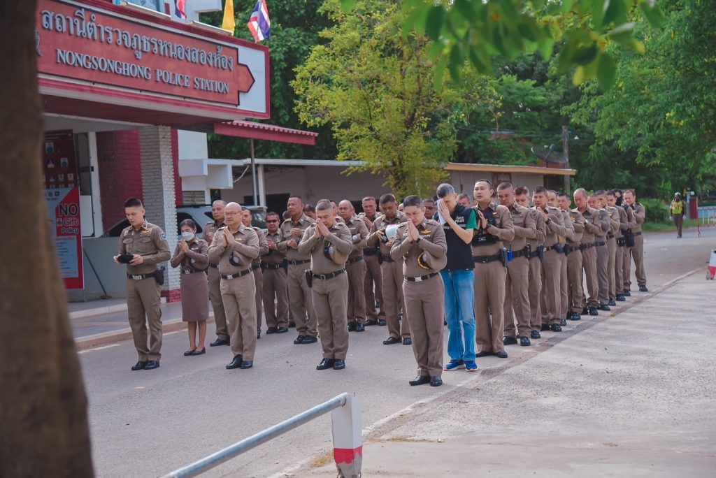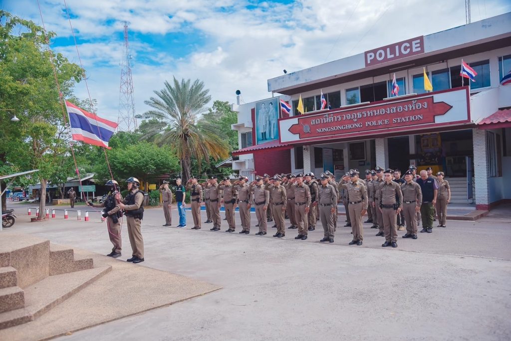 พร้อมด้วยข้าราชการตำรวจ สภ.หนองสองห้อง ร่วมเคารพธงชาติ สวดมนต์ไหว้พระ กล่าวบทปลงใจ ท่องอุดมคติตำรวจ ปฏิญาณตน ประชุมชี้แจงข้อราชการ ข้อสั่งการ และนโยบายผู้บังคับบัญชาให้ได้รับทราบและถือปฏิบัติ ดังนี้.-