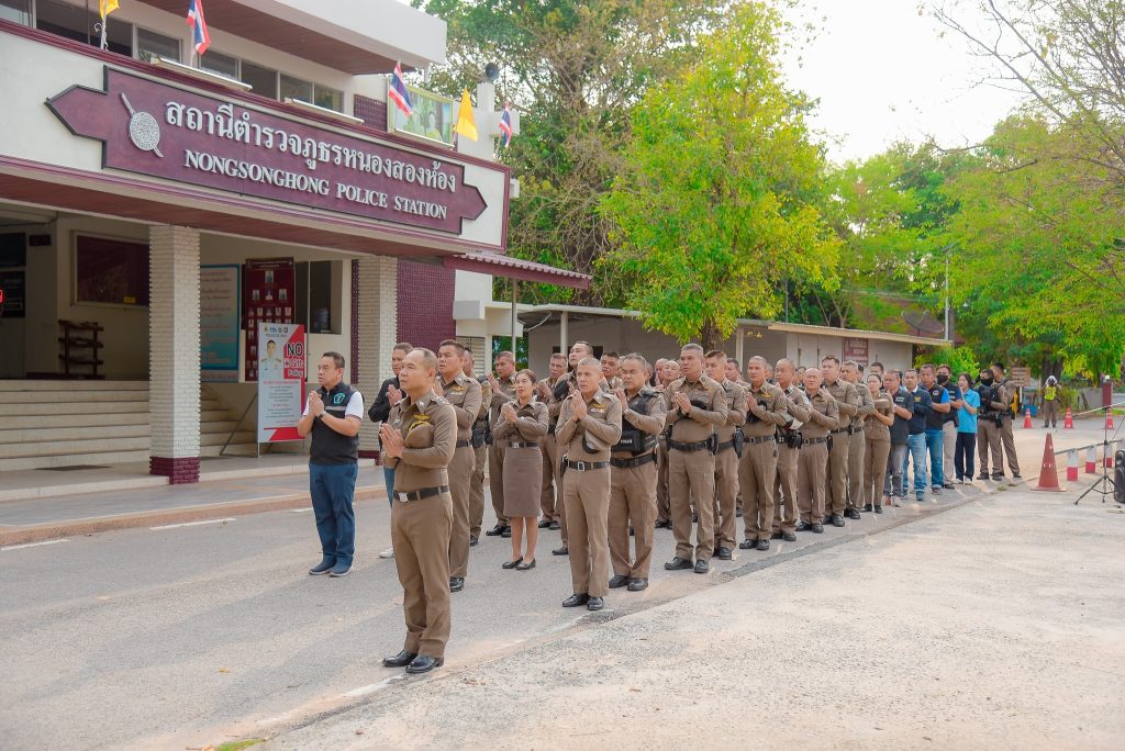 พร้อมด้วยข้าราชการตำรวจ สภ.หนองสองห้อง ร่วมเคารพธงชาติ สวดมนต์ไหว้พระ กล่าวบทปลงใจ ท่องอุดมคติตำรวจ ปฏิญาณตน ประชุมชี้แจงข้อราชการ ข้อสั่งการ และนโยบายผู้บังคับบัญชาให้ได้รับทราบและถือปฏิบัติ ดังนี้.-