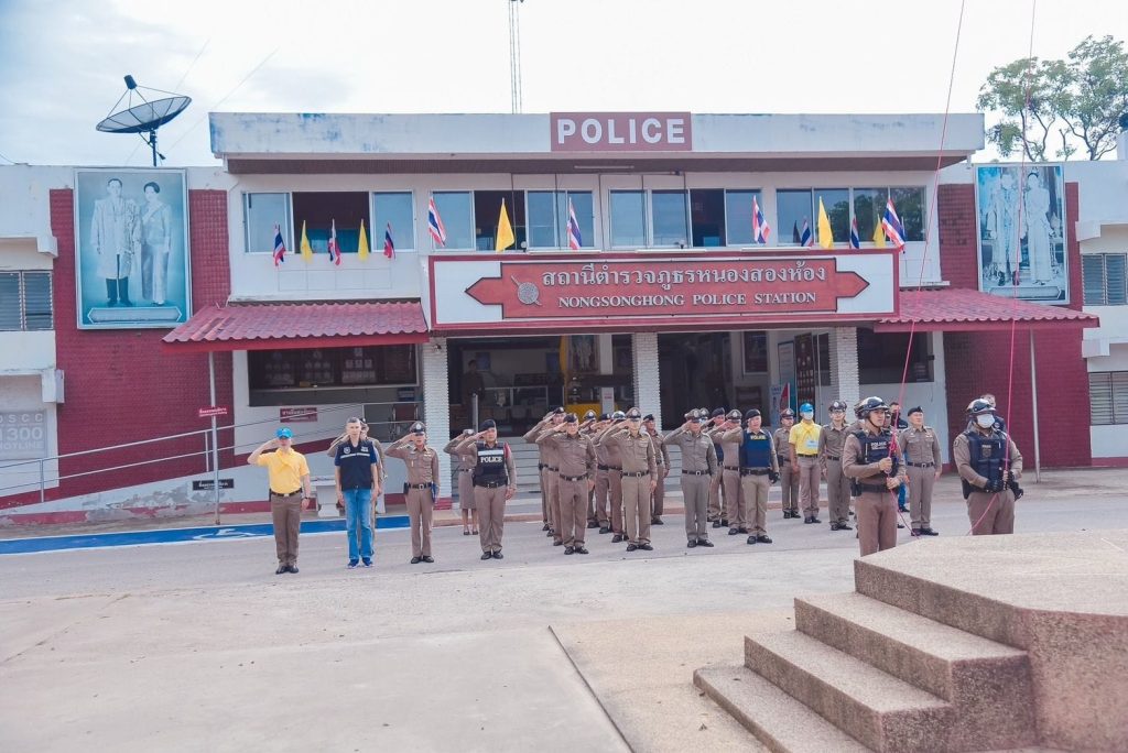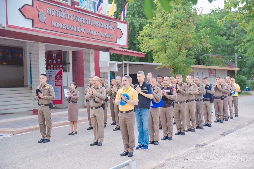 พร้อมด้วยข้าราชการตำรวจ สภ.หนองสองห้อง ร่วมเคารพธงชาติ สวดมนต์ไหว้พระ กล่าวบทปลงใจ ท่องอุดมคติตำรวจ ปฏิญาณตน ประชุมชี้แจงข้อราชการ