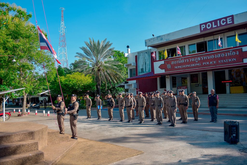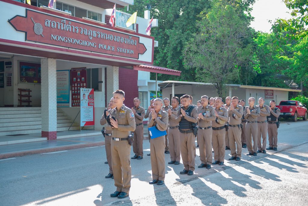 พร้อมด้วยข้าราชการตำรวจ สภ.หนองสองห้อง ร่วมเคารพธงชาติ สวดมนต์ไหว้พระ กล่าวบทปลงใจ ท่องอุดมคติตำรวจ ปฏิญาณตน ประชุมชี้แจงข้อราชการ ข้อสั่งการ และนโยบายผู้บังคับบัญชาให้ได้รับทราบและถือปฏิบัติ ดังนี้.-