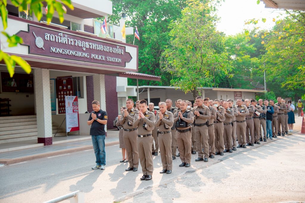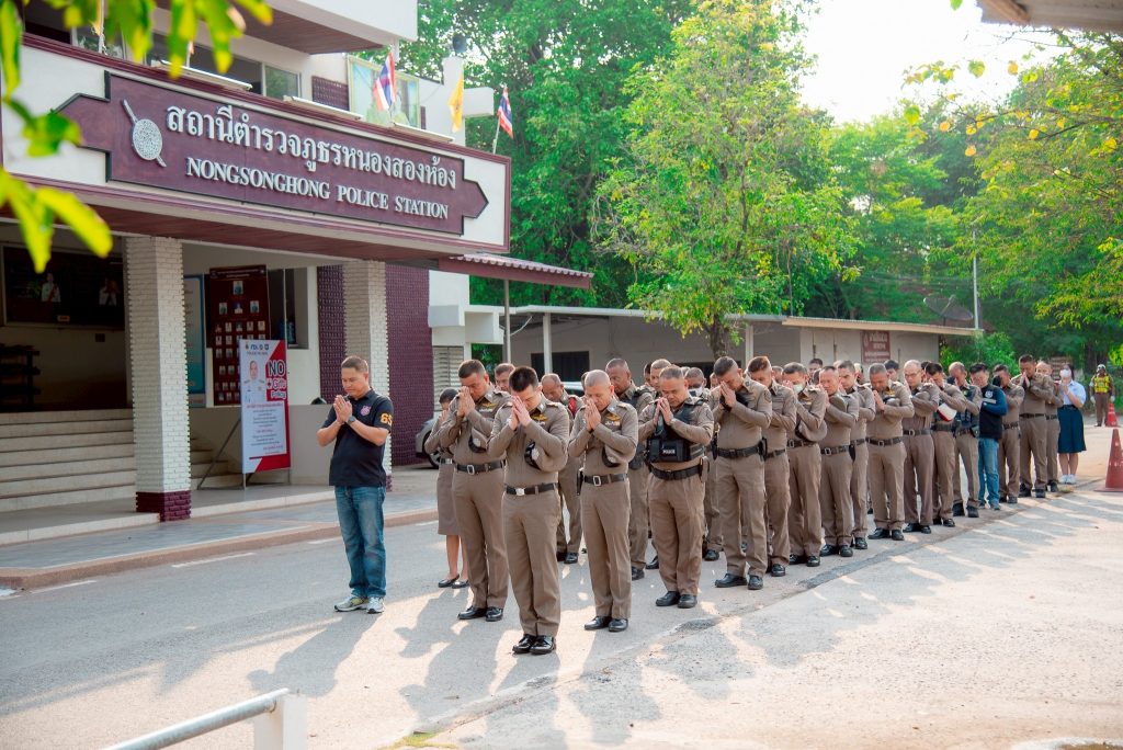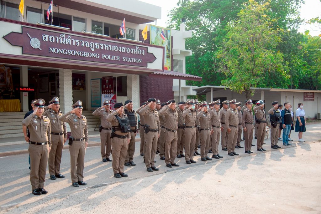 พร้อมด้วยข้าราชการตำรวจ สภ.หนองสองห้อง ร่วมเคารพธงชาติ สวดมนต์ไหว้พระ กล่าวบทปลงใจ ท่องอุดมคติตำรวจ ปฏิญาณตน ประชุมชี้แจงข้อราชการ ข้อสั่งการ และนโยบายผู้บังคับบัญชาให้ได้รับทราบและถือปฏิบัติ ดังนี้.-