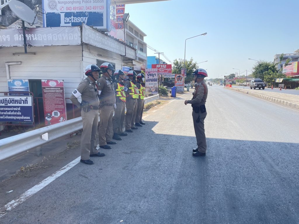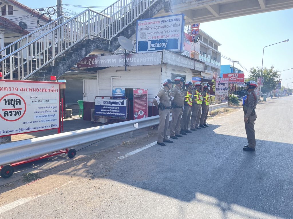 พ.ต.ท.สุจินต์ แสงลี สวป.สภ.หนองสองห้อง , ร.ต.ท.วัชรินทร์ สมพมิตรรอง สว.(ป.)ฯ ร้อยเวร 60 ปล่อยแถวชุดสายตรวจจราจร ก่อนตั้งจุดตรวจกวดขันวินัยจราจร บริเวณตู้ยามสะพานลอย ทล.2440 ต.หนองสองห้อง อ.หนองสองห้อง จ.ขอนแก่น กำชับการปฏิบัติ ดังนี้