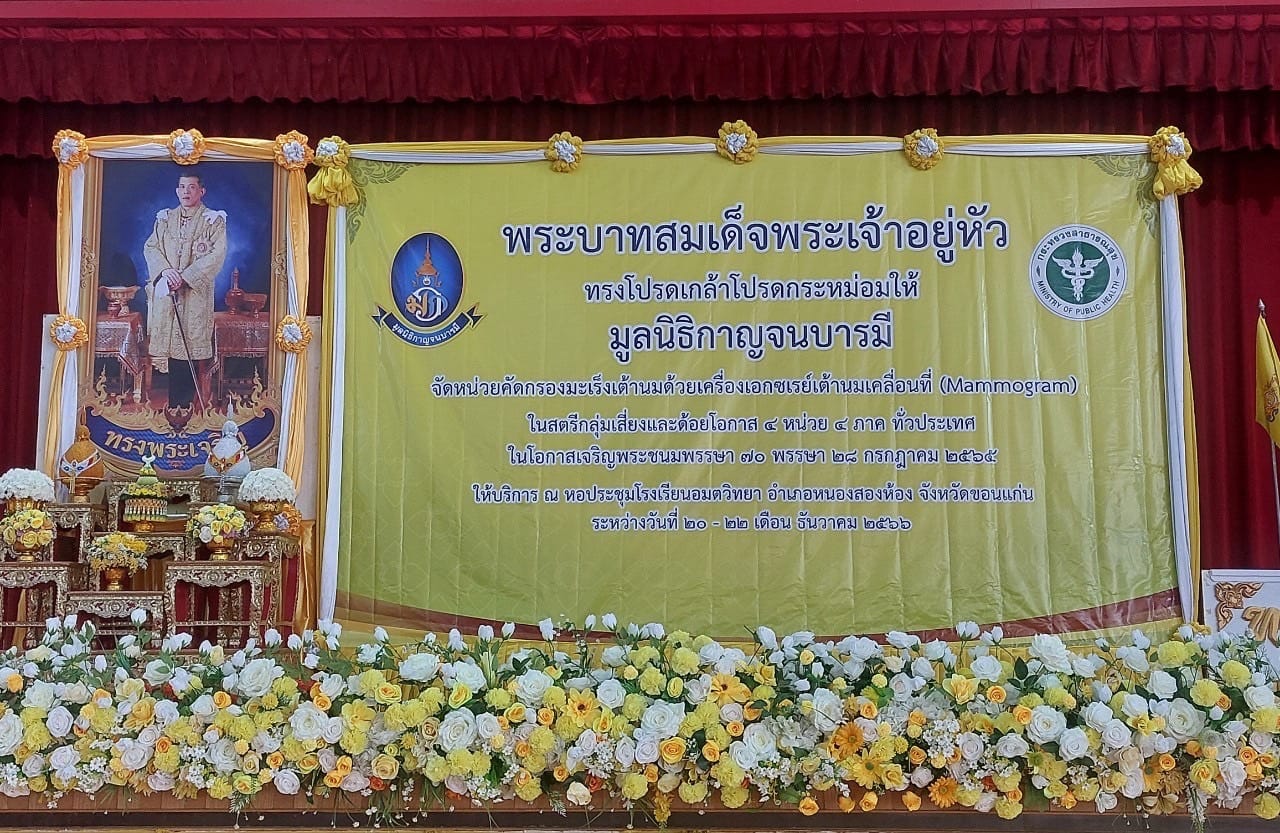 ร่วมพิธีเปิดโครงการคัดกรองมะเร็งเต้านม โดยเครื่องเอ็กซเรย์เต้านมเคลื่อนที่ (Mammogram) ในกลุ่มสตรีเสี่ยงภัยและด้อยโอกาศ เฉลิมพระเกียรติพระบาทสมเด็จพระเจ้าอยู่หัวฯ ในโอกาสเจริญพระชนมพรรษา ครบ 70 พรรษา 28 กรกฎาคม 2566 โดยมี นพ.ประวีร์ คำศรีสุข รองนายแพทย์สาธารณสุขจังหวัดขอนแก่น เป็นประธานในพิธี พร้อมด้วย นายประจักร์ ไชยกิจ นายอำเภอหนองสองห้อง , ดร.รัตนาภรณ์ สมบูรณ์ ที่ปรึกษารัฐมนตรีกระทรวงวัฒนธรรม , แพทย์หญิงสุมาลี วนาทรัพย์ดำรง ผู้อำนวยการโรงพยาบาลหนองสองห้อง , ดร.นายแพทย์อิทธิพล สูงแข็ง ผู้แทนมูลนิธิกาญจนบารมีบรรยายให้ความรู้เกี่ยวกับโรคมะเร็งเต้านมฯ ณ หอประชุมโรงเรียนอมตวิทยา อำเภอหนองสองห้อง จังหวัดขอนแก่น