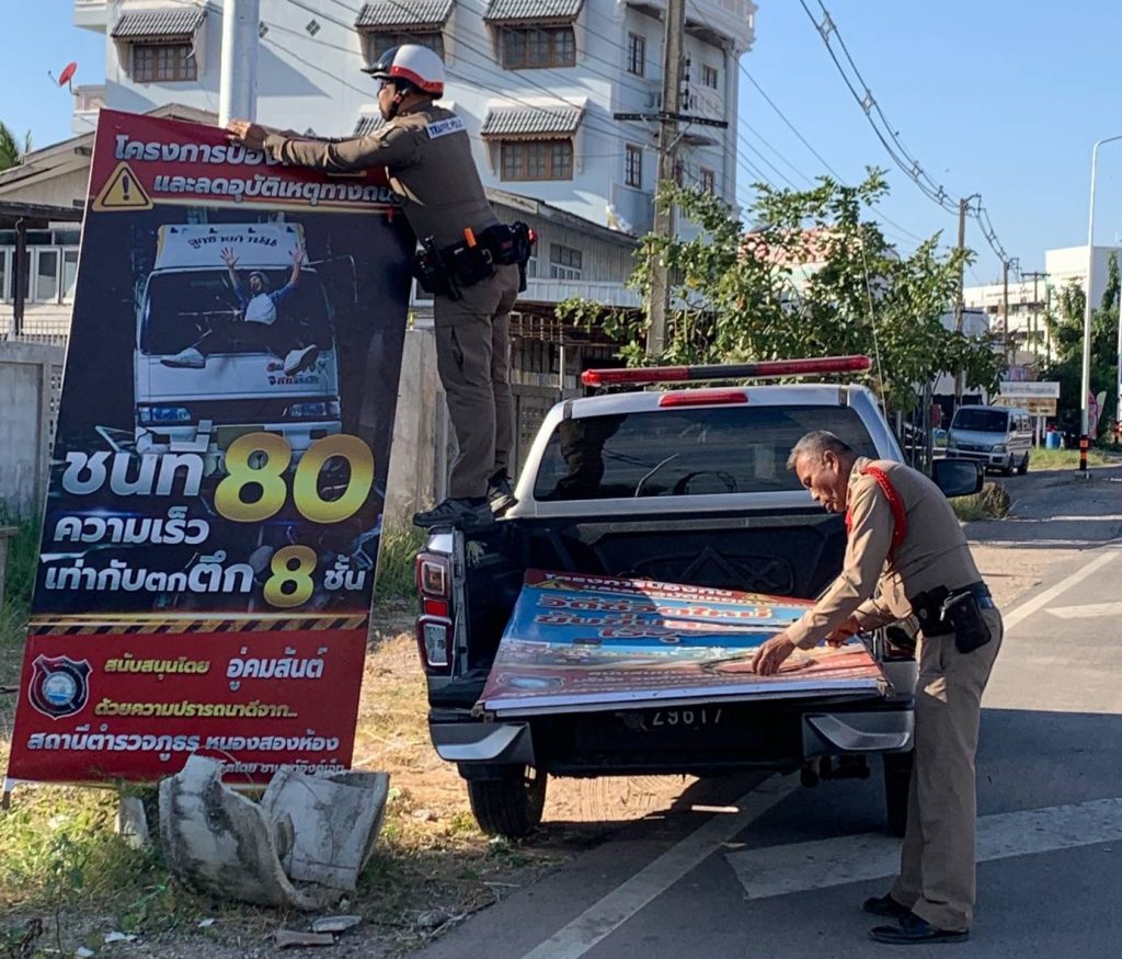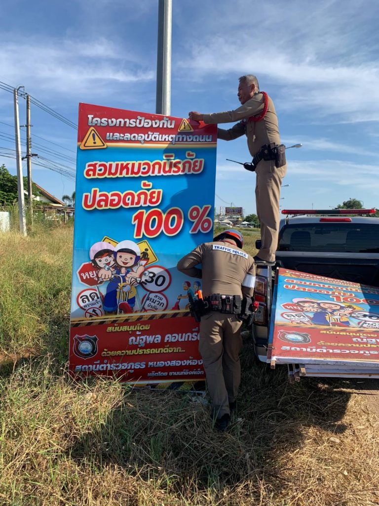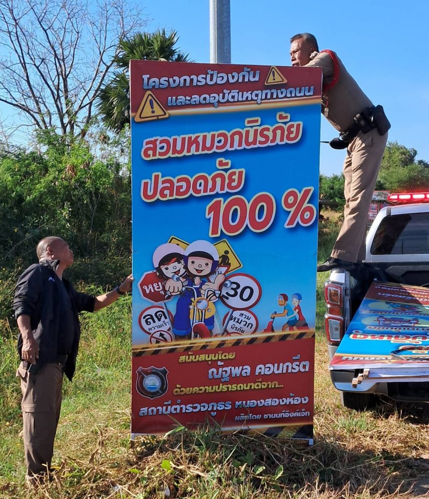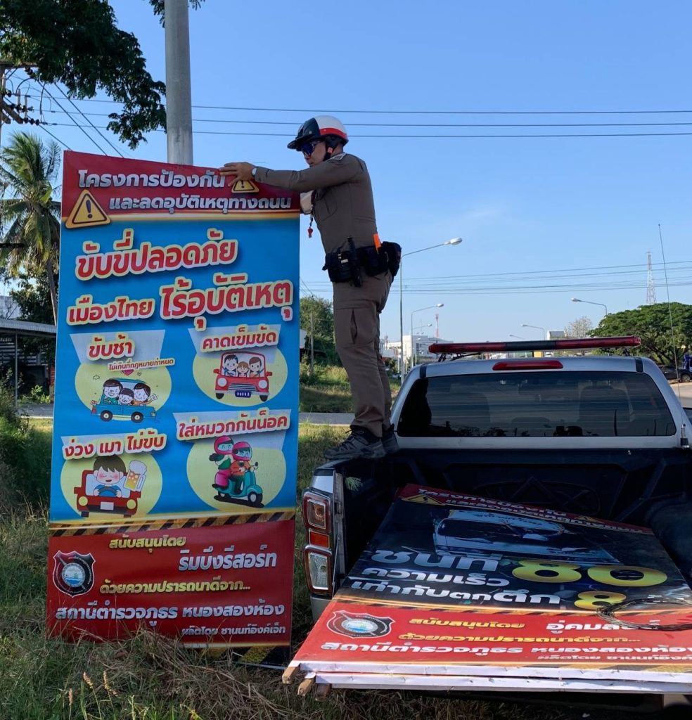 ร้อยเวรจราจร พร้อมชุดสายตรวจจราจรเวร ออกติดตั้งป้ายประชาสัมพันธ์ เพื่อป้องกันและลดอุบัติเหตุทางถนนห้วงเทศกาลปีใหม่ 2569