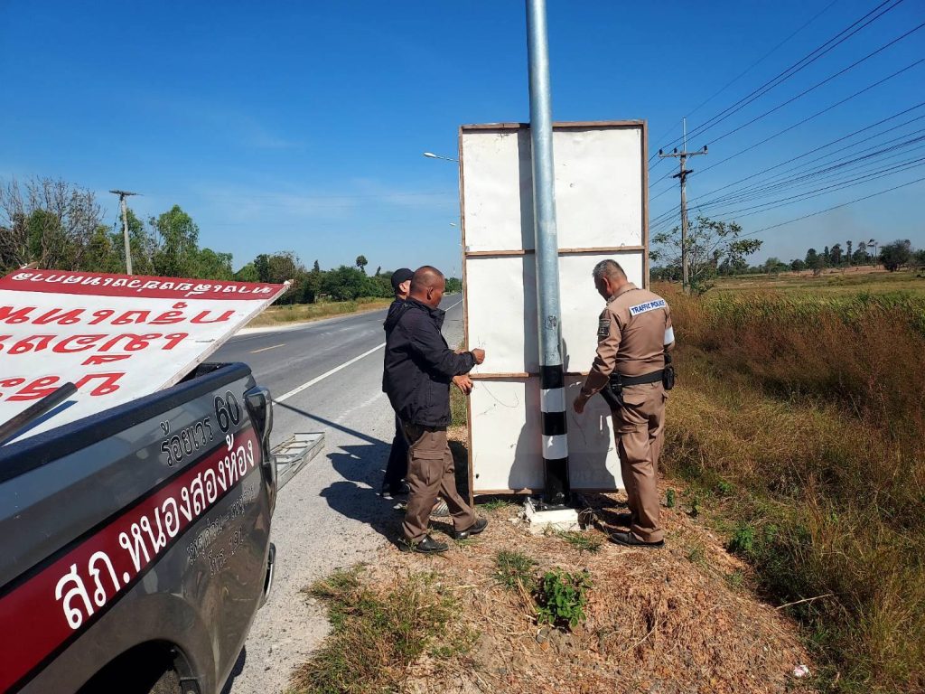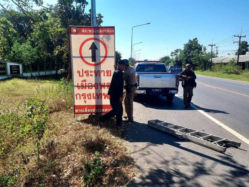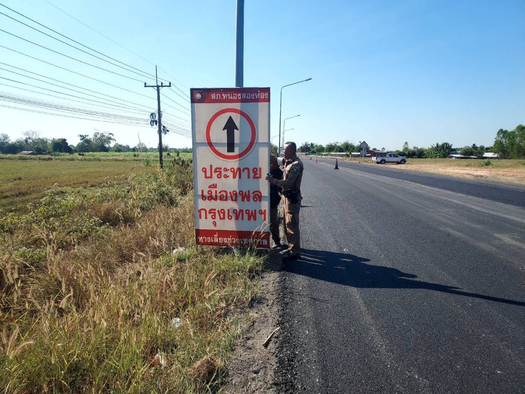 ร.ต.อ.บัณถัทร ทองสง่า ร้อยเวร จราจร พร้อมชุดสายตรวจจราจรเวร ออกติดป้ายบอกเส้นทางเลี่ยงการจราจรช่วงเทศกาลปีใหม่ 2569 ที่ถนนเส้นหินตั้ง – หนองสองห้อง ทล 3201