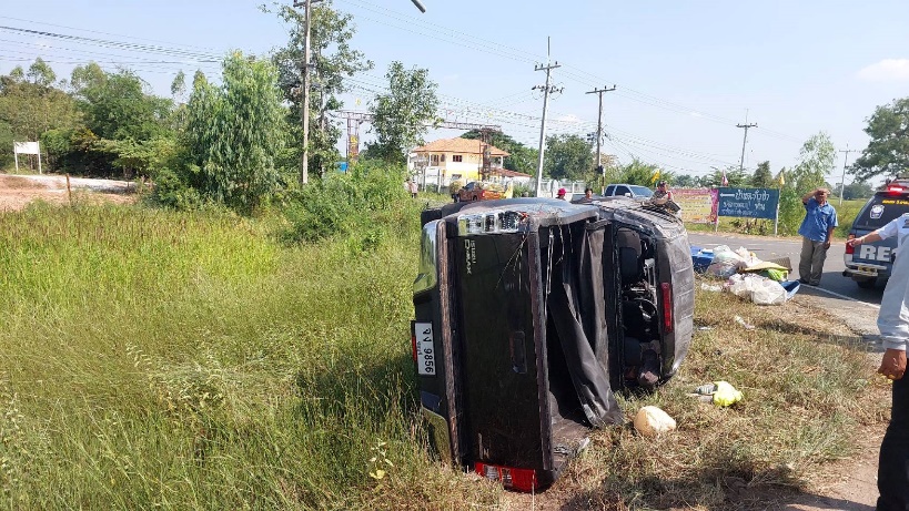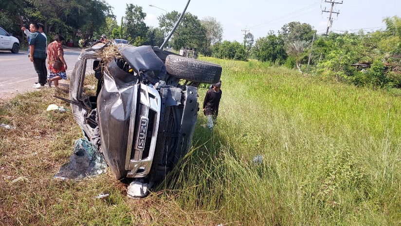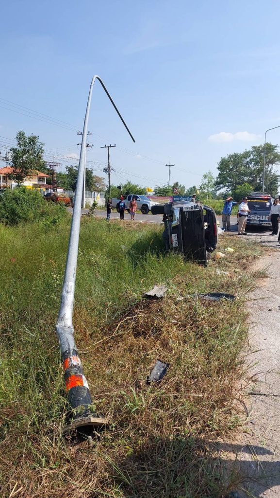 -สาเหตุ คนขับพร้อมพวก ได้กลับมาจากทำบุญล้างป่าช้า ที่ จ.สกลนคร พอขับมาที่เกิดเหตุ เกิดอาการหลับใน จึงทำให้รถเสียการควบคุม พลิกคว่ำไปชนเสาไฟฟ้าส่องสว่าง แล้วพุ่งไปข้าง ทำให้ได้รับบาดเจ็บ