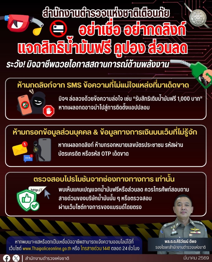 สำนักงานตำรวจแห่งชาติ แจ้งเตือนประชาชน ระวังมิจฉาชีพฉวยโอกาสจากสถานการณ์ความกังวลเรื่องราคาพลังงาน ส่ง SMS หรือโฆษณาในโซเชียล แอบอ้างเป็นบริษัทน้ำมันชื่อดัง อ้างแจก คูปองเติมน้ำมันฟรี หรือส่วนลดพิเศษ เพื่อหลอกให้กดลิงก์ปลอม