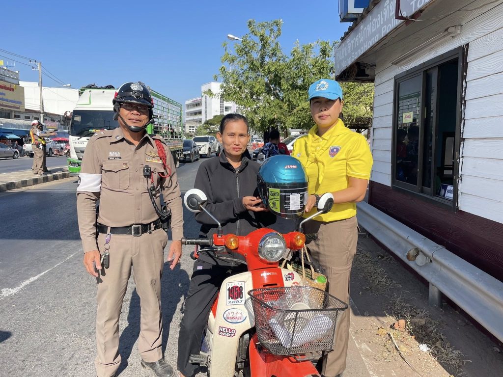 รอง สว.(ป.)สภ.หนองสองห้อง ปฎิบัติหน้าที่ร้อยเวร 60 พร้อมด้วยชุดจราจร และประชาชนจิตอาสา ร่วมกันแจกหมวกนิรภัยแก่ประชาชนที่ขับขี่รถจักรยานยนต์สัญจรตาม #โครงการจิตอาสาจราจร #รณรงค์ขับขี่ปลอดภัยสวมหมวกนิรภัย เพื่อลดอุบัติเหตุจราจร ในช่วงเทศกาลปีใหม่ 2568 ณ จุดตรวจสะพานลอย ถนนเจนจบทิศ
