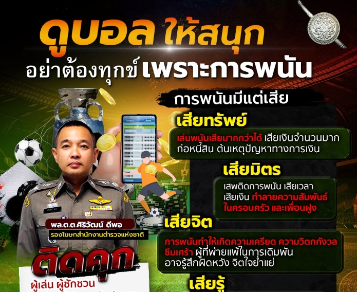 ข่าวประชาสัมพันธ์ ดูบอลให้สนุก อย่าต้องทุกข์เพราะการพนัน สำนักงานตำรวจแห่งชาติเตือน ดูบอลให้สนุก อย่