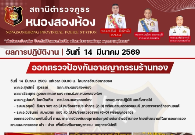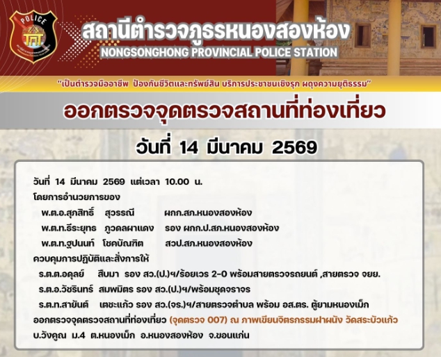 งานป้องกันปราบปราม/งานสืบสวน/งานจราจร ออกตรวจจุดสถานที่ท่องเที่ยว 14 มีนาคม 2569 ▼ข่าวภารกิจผู้บังคั
