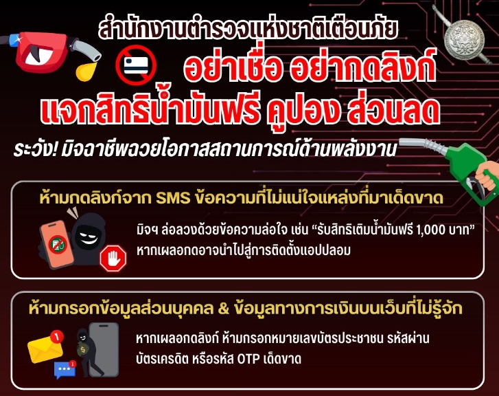 ข่าวประชาสัมพันธ์ เตือนภัยมิจฉาชีพ! อ้างแจก “คูปองเติมน้ำมันฟรี” หลอกกดลิงก์ ดูดข้อมูล-ดูดเงิน เตือน