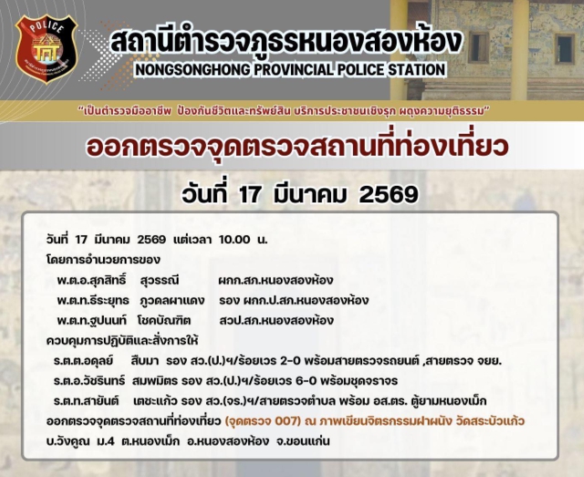 งานป้องกันปราบปราม/งานสืบสวน/งานจราจร ออกตรวจจุดสถานที่ท่องเที่ยว 17 มีนาคม 2569 ▼ข่าวภารกิจผู้บังคั