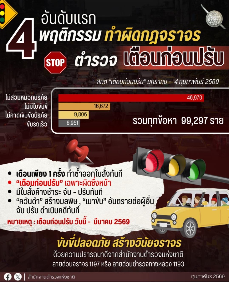 ข่าวประชาสัมพันธ์ 4 อันดับแรก พฤติกรรมทำผิดกฎจราจร ที่ตำรวจจราจร “เตือนก่อนปรับ” เพียงช่วงเวลา 1 เดื