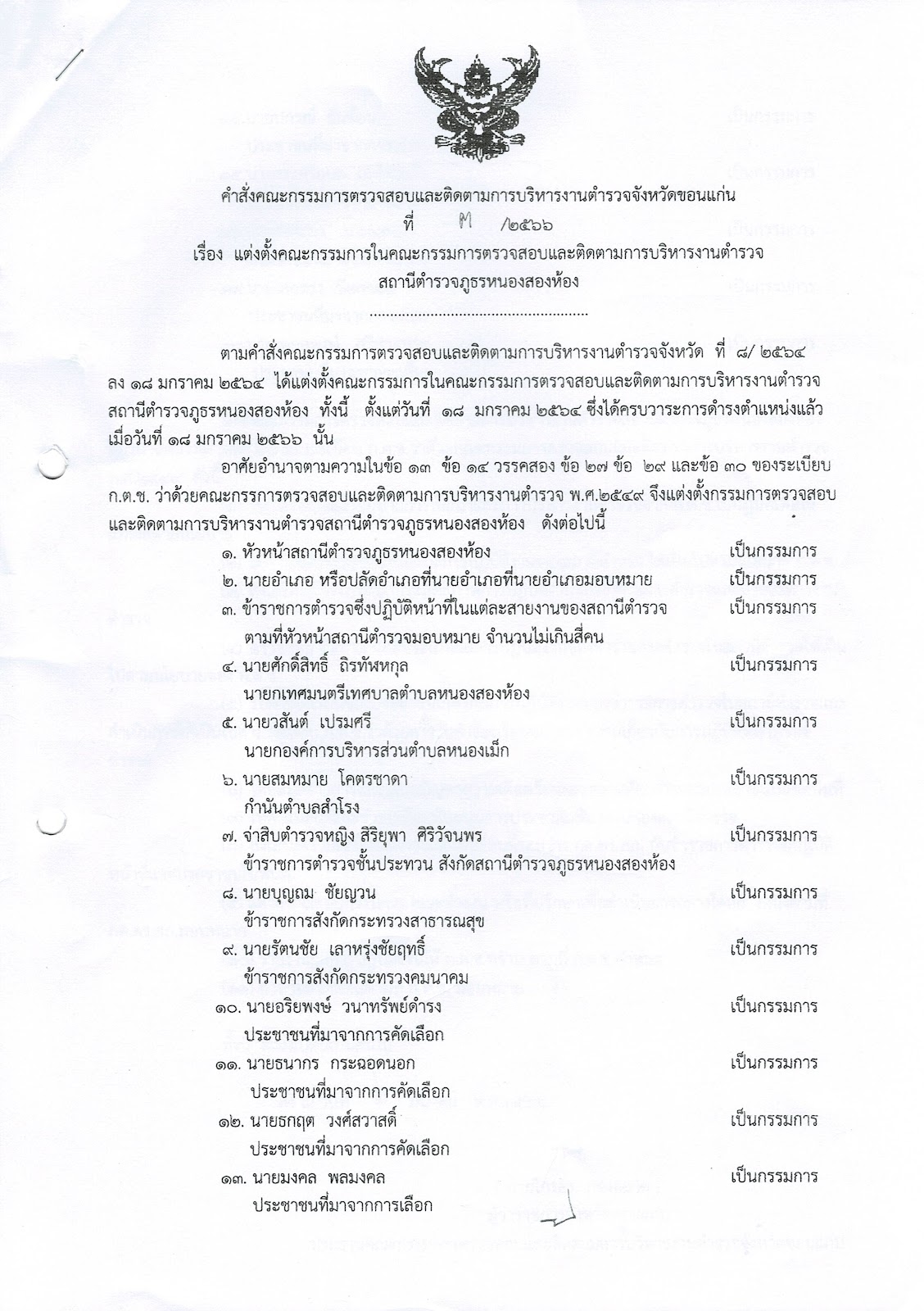 คำสั่งคณะกรรมการตรวจสอบและติดตามการบริหารงานตำรวจจังหวัดขอนแก่น